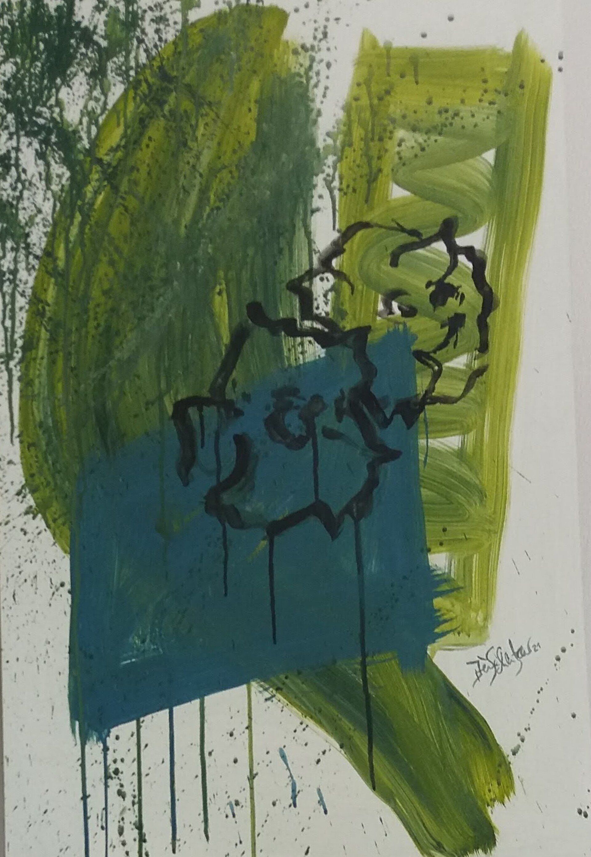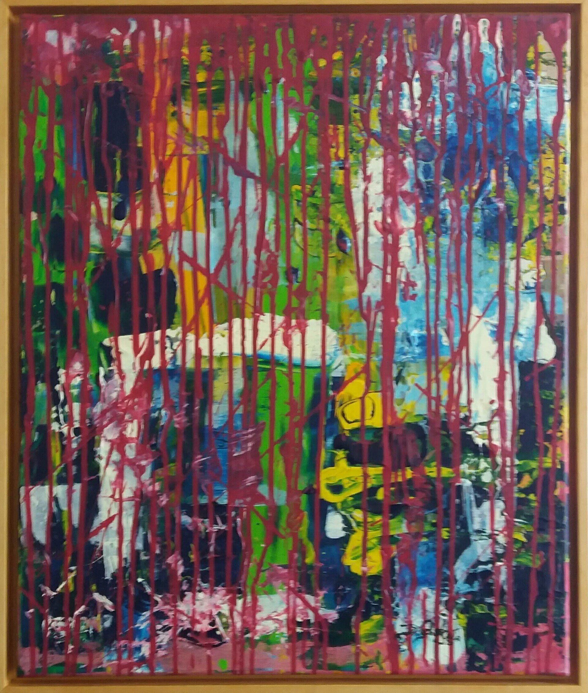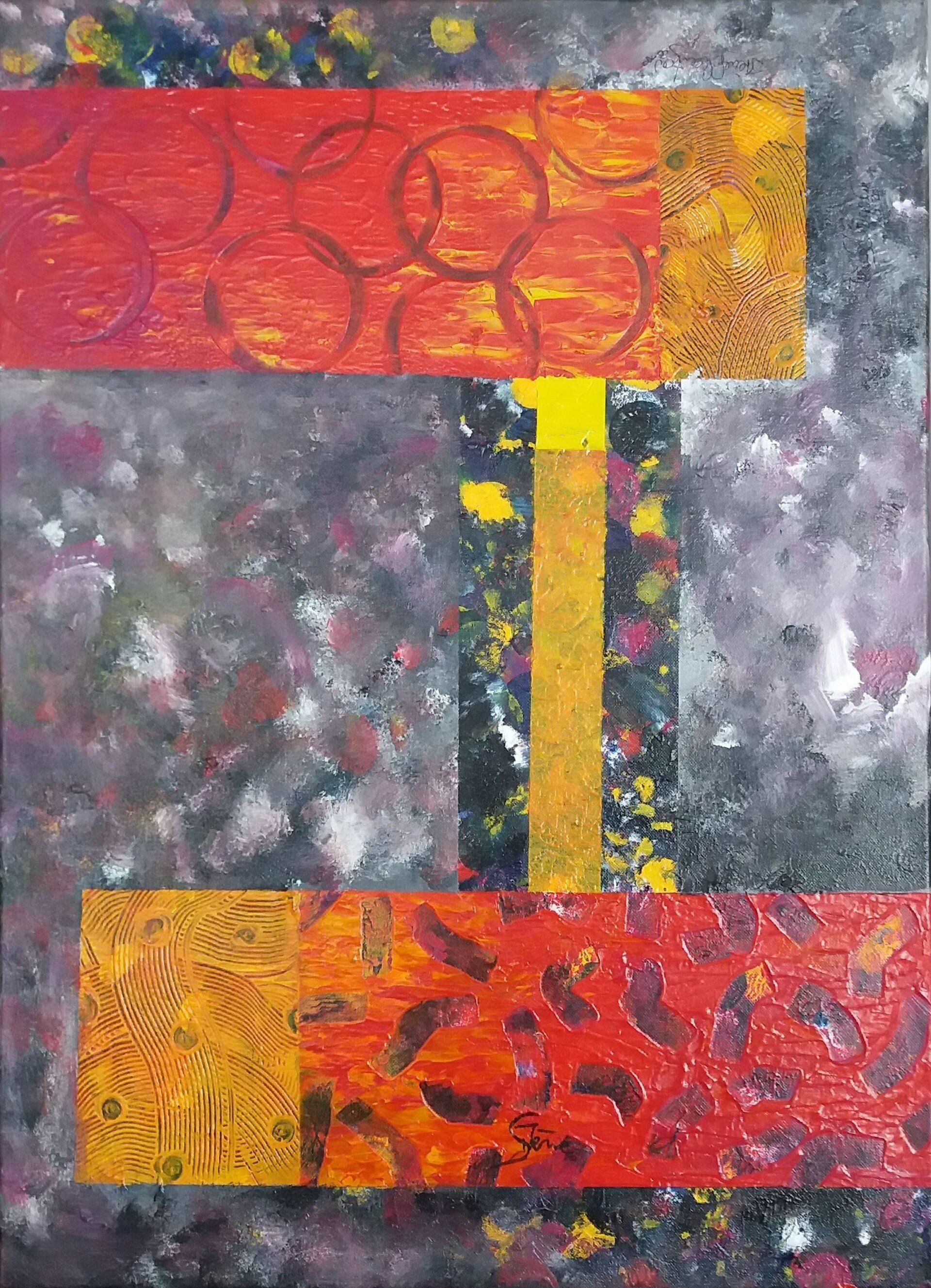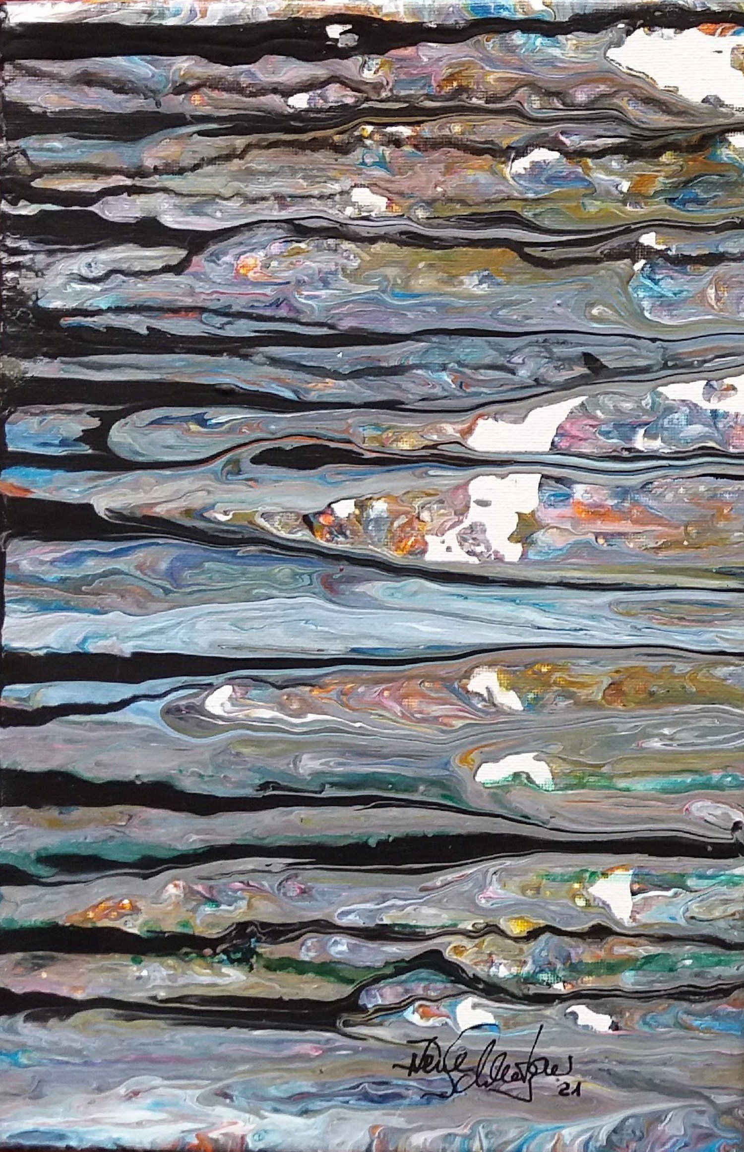 Nach einer längeren Pause beginne ich mit Stöcken, Schwämmen und mit Acrylfarben auf Leinwänden zu arbeiten. Siebe, Zahnbürsten, Plastikkarten kommen dazu. Malen mit Fingern, Füssen und Armen verbinden mich mit Farbe und Ausdruck.