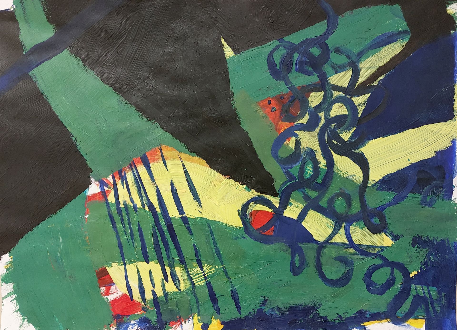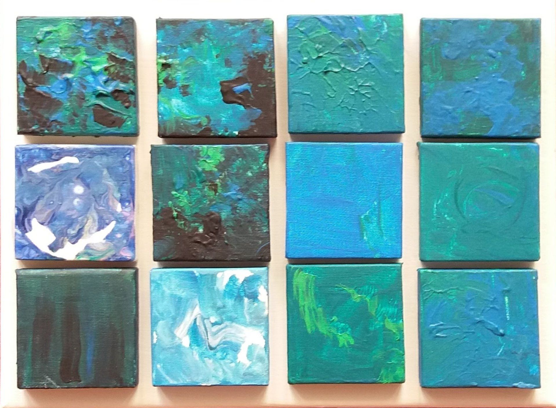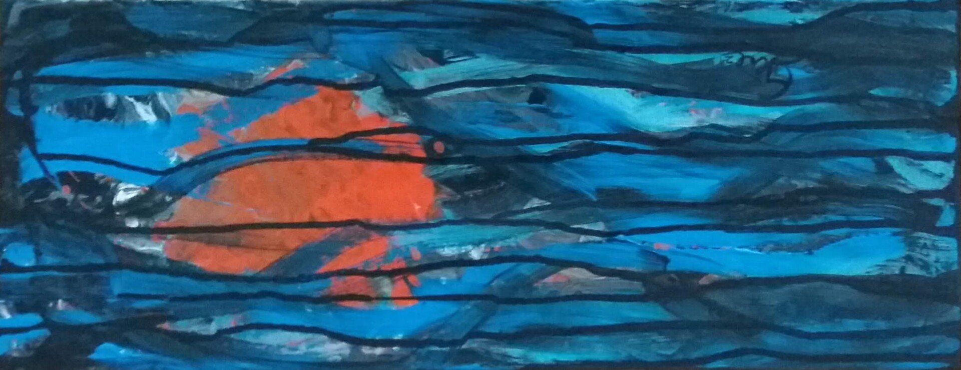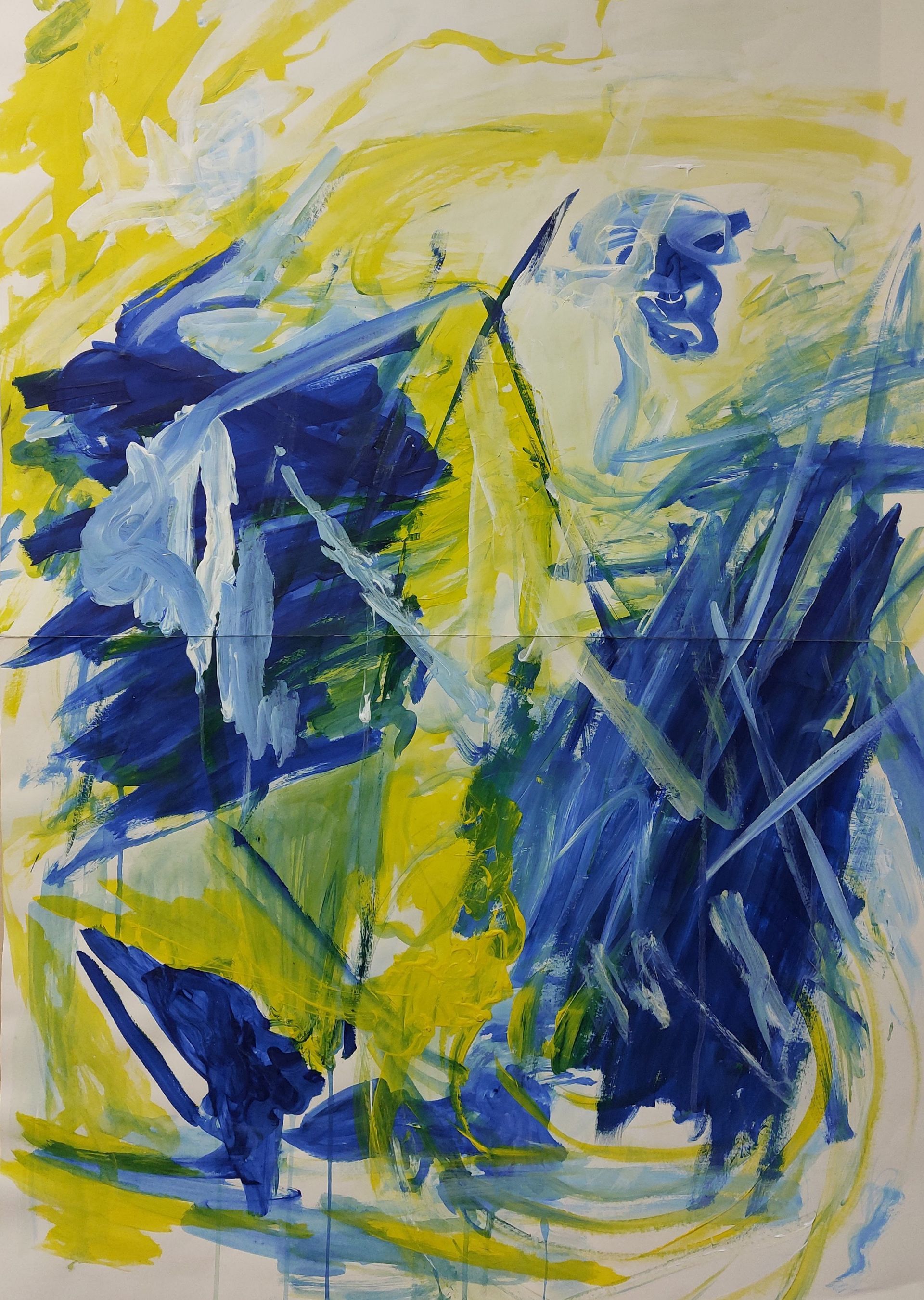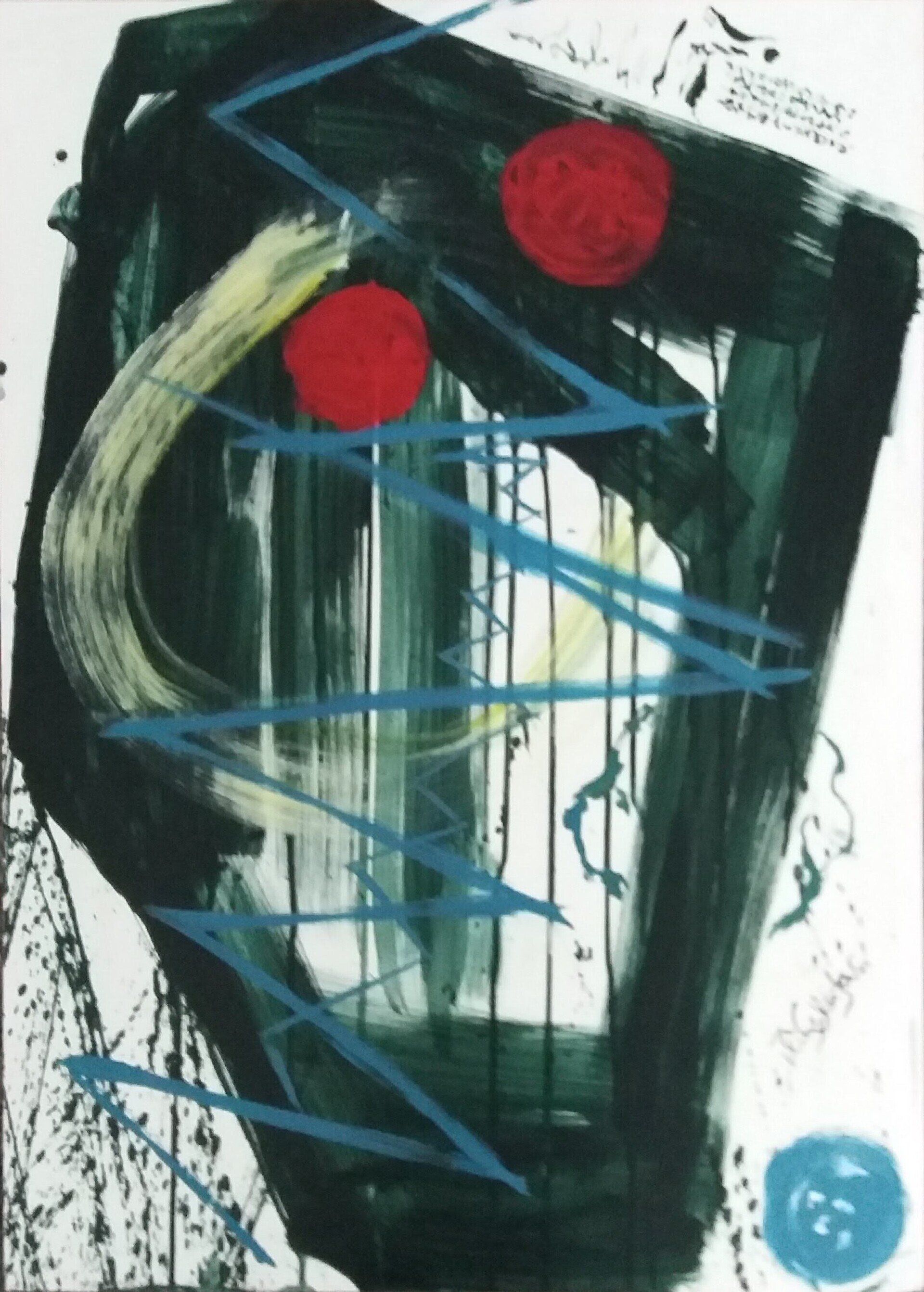 Nach einer längeren Pause beginne ich mit Stöcken, Schwämmen und mit Acrylfarben auf Leinwänden zu arbeiten. Siebe, Zahnbürsten, Plastikkarten kommen dazu. Malen mit Fingern, Füssen und Armen verbinden mich mit Farbe und Ausdruck.