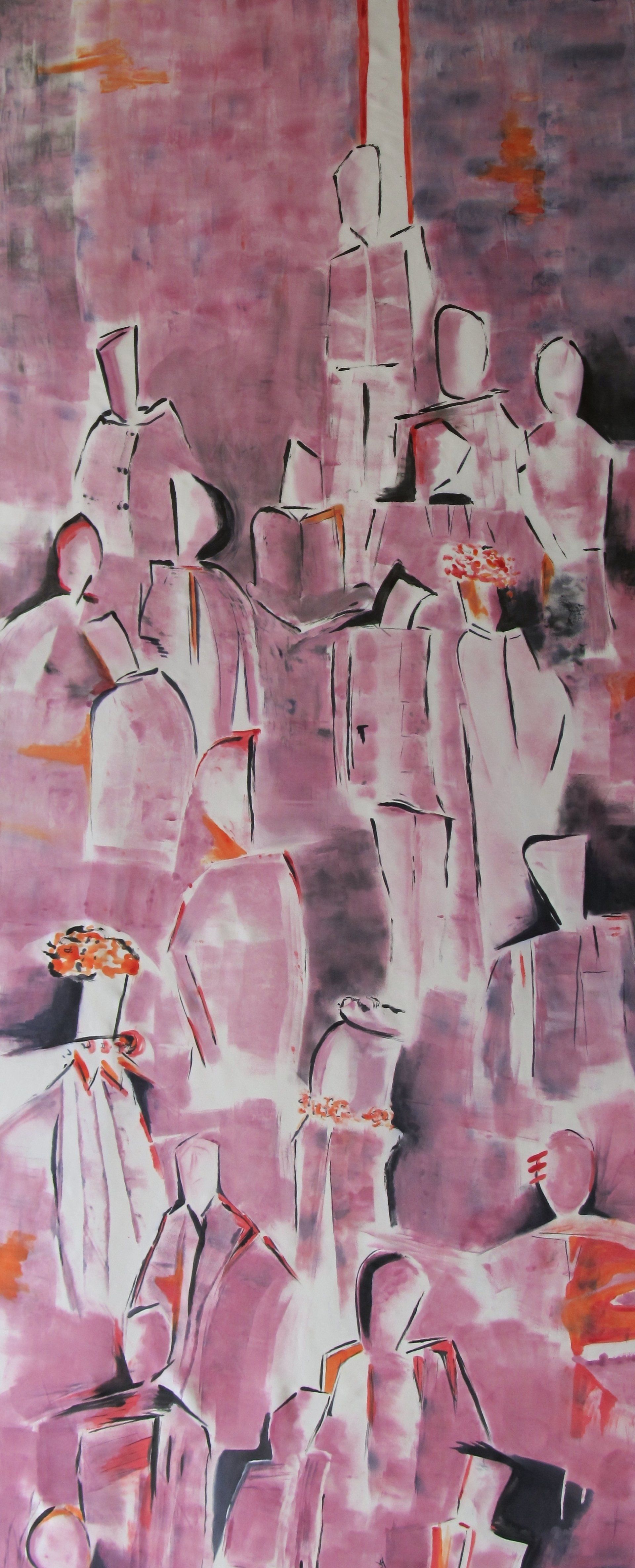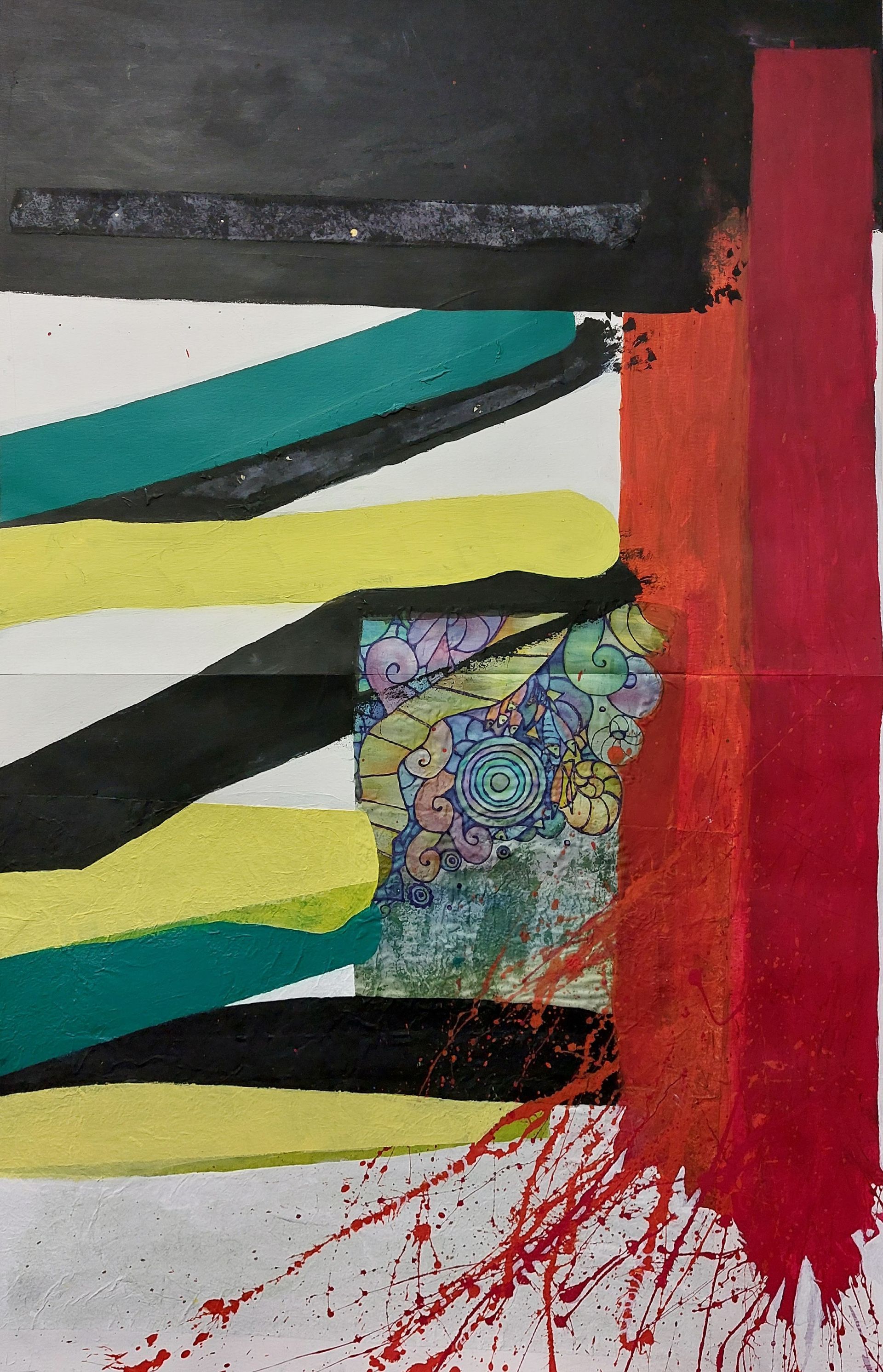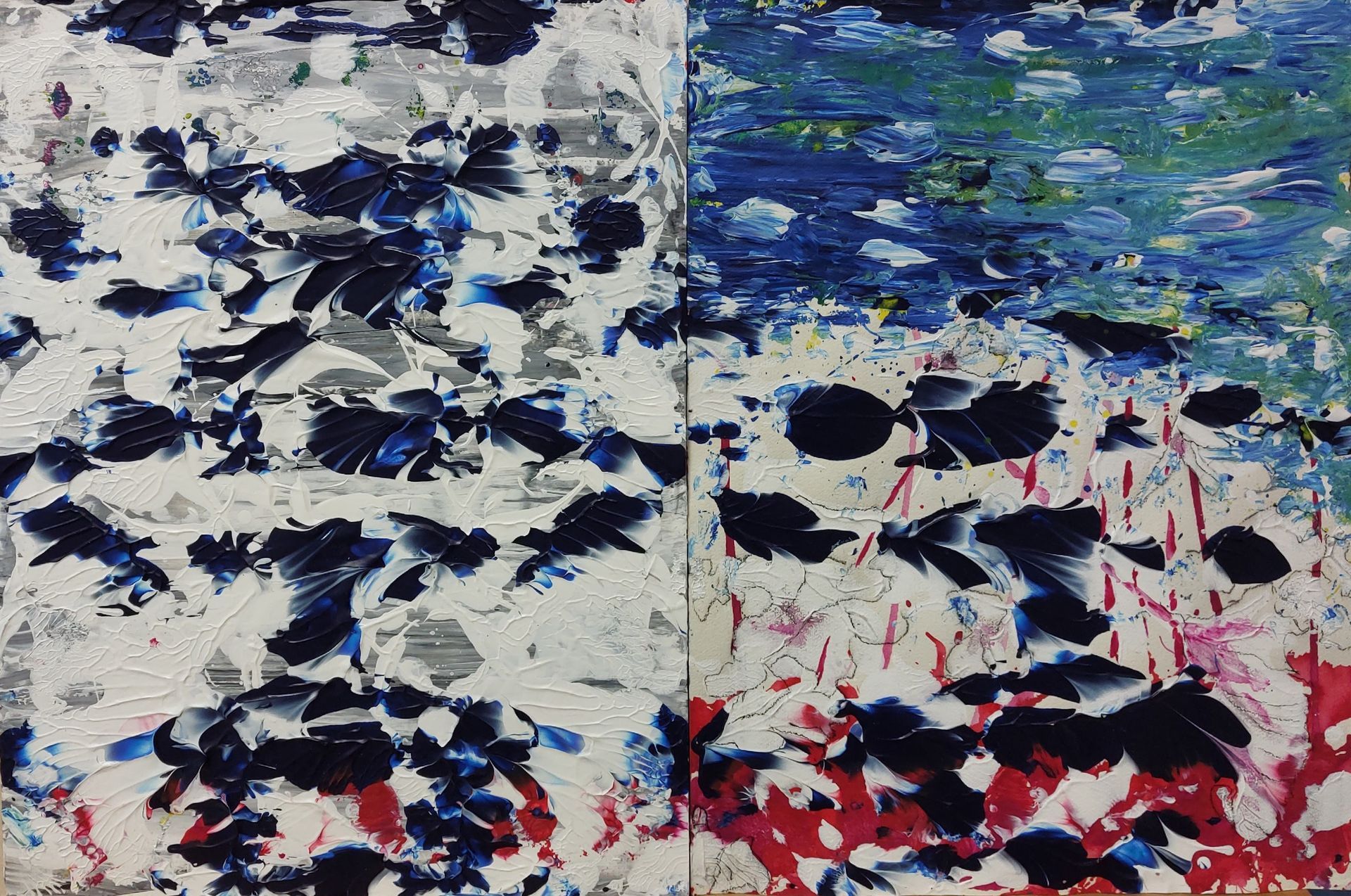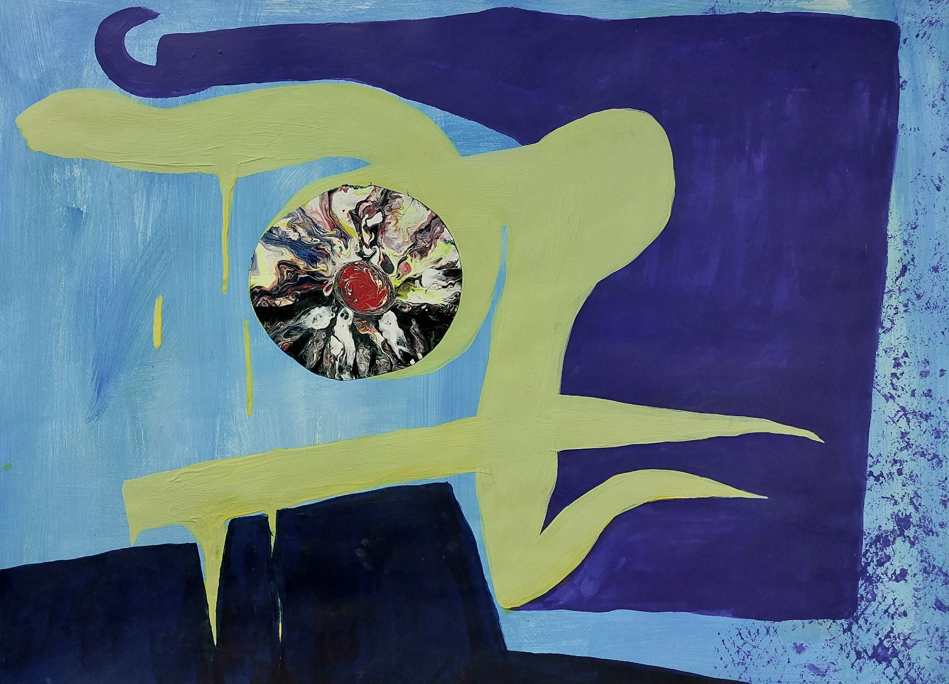 Nach einer längeren Pause beginne ich mit Stöcken, Schwämmen und mit Acrylfarben auf Leinwänden zu arbeiten. Siebe, Zahnbürsten, Plastikkarten kommen dazu. Malen mit Fingern, Füssen und Armen verbinden mich mit Farbe und Ausdruck.
