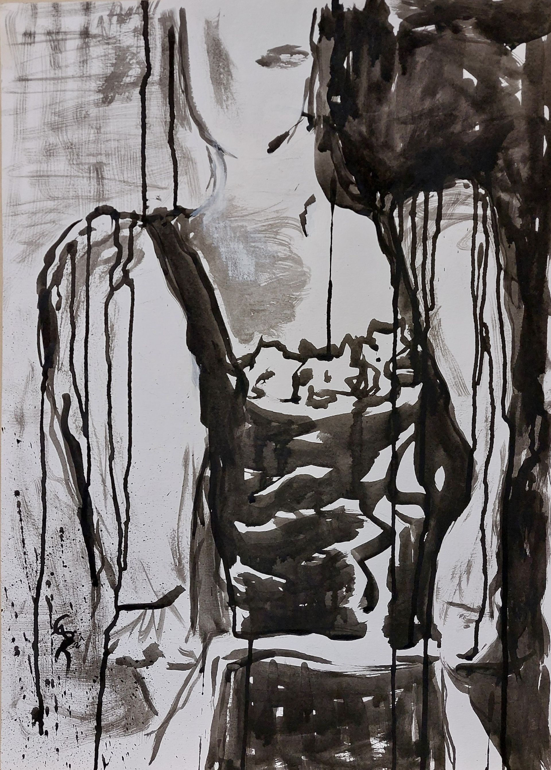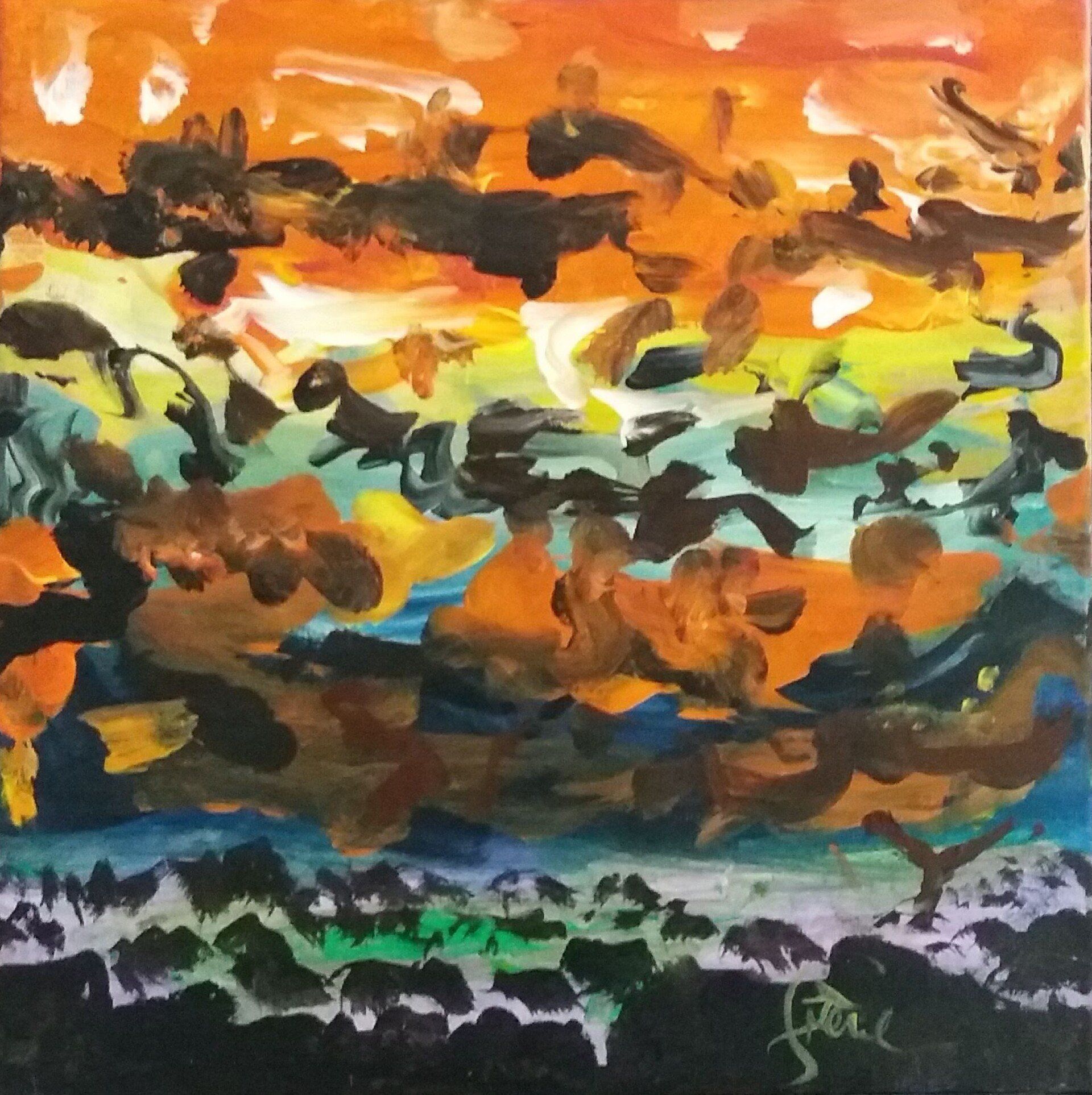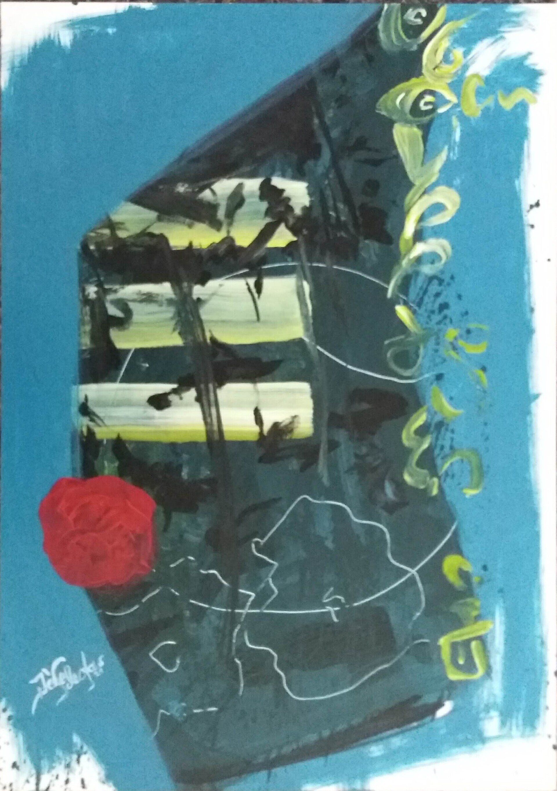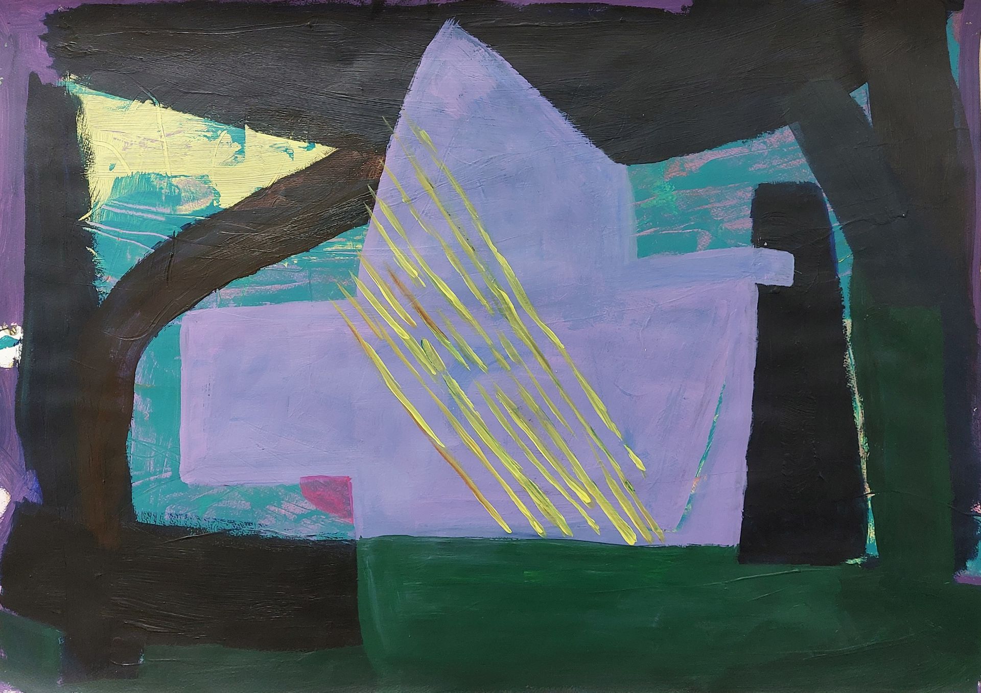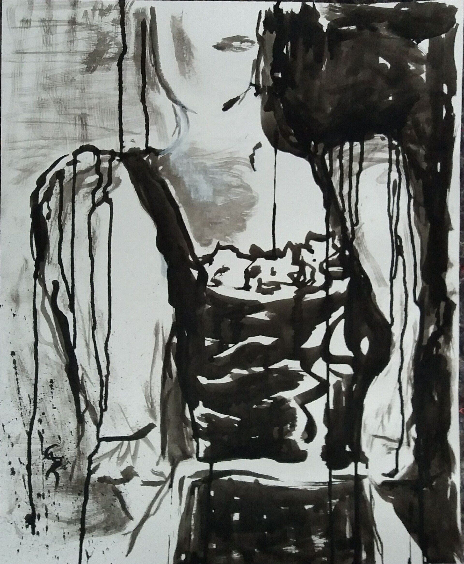 Nach einer längeren Pause beginne ich mit Stöcken, Schwämmen und mit Acrylfarben auf Leinwänden zu arbeiten. Siebe, Zahnbürsten, Plastikkarten kommen dazu. Malen mit Fingern, Füssen und Armen verbinden mich mit Farbe und Ausdruck.