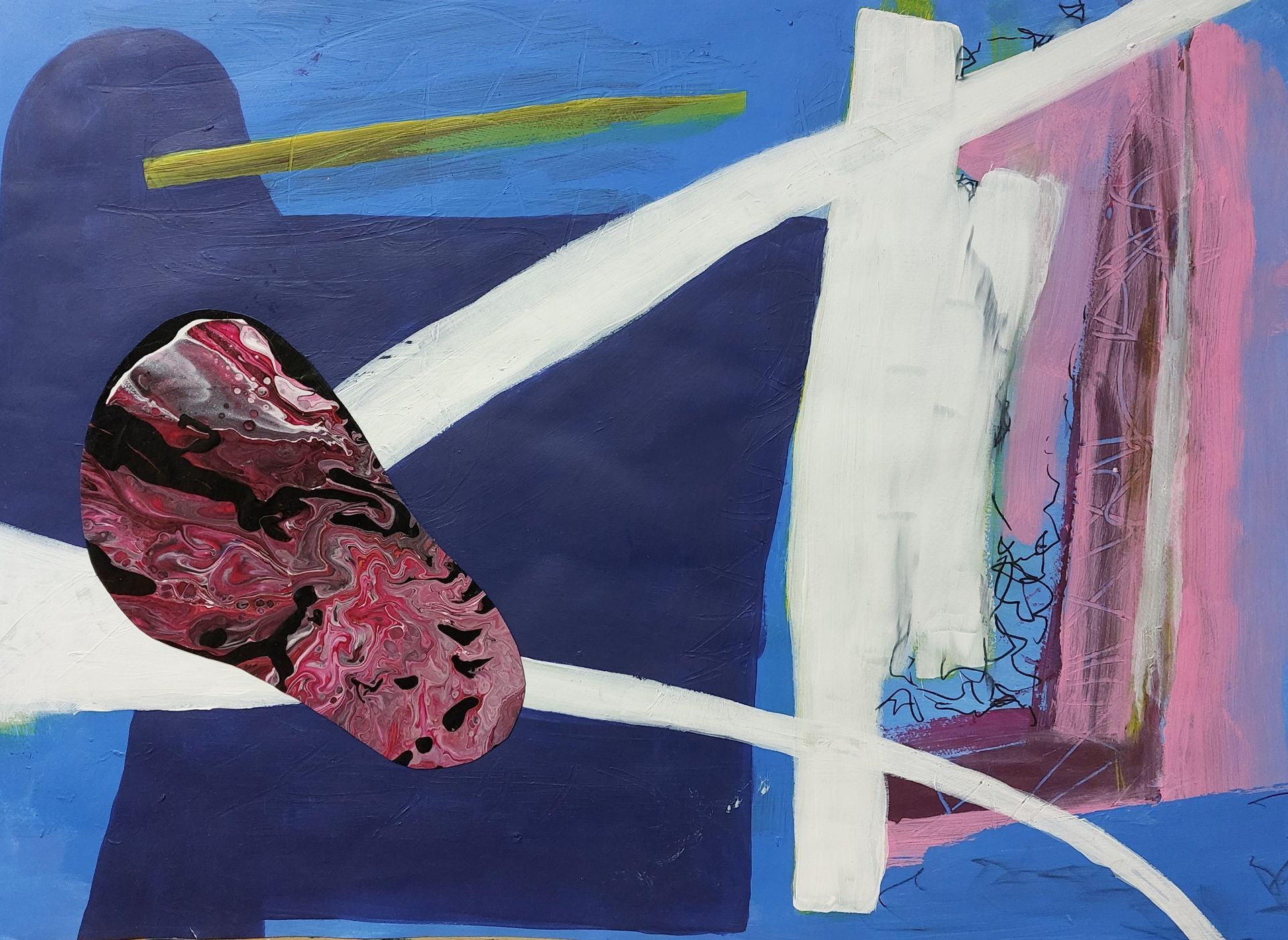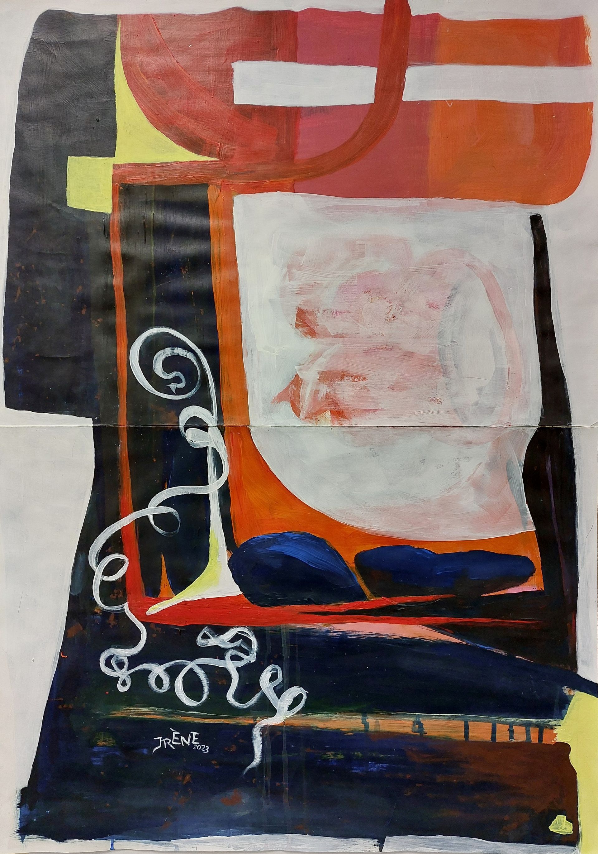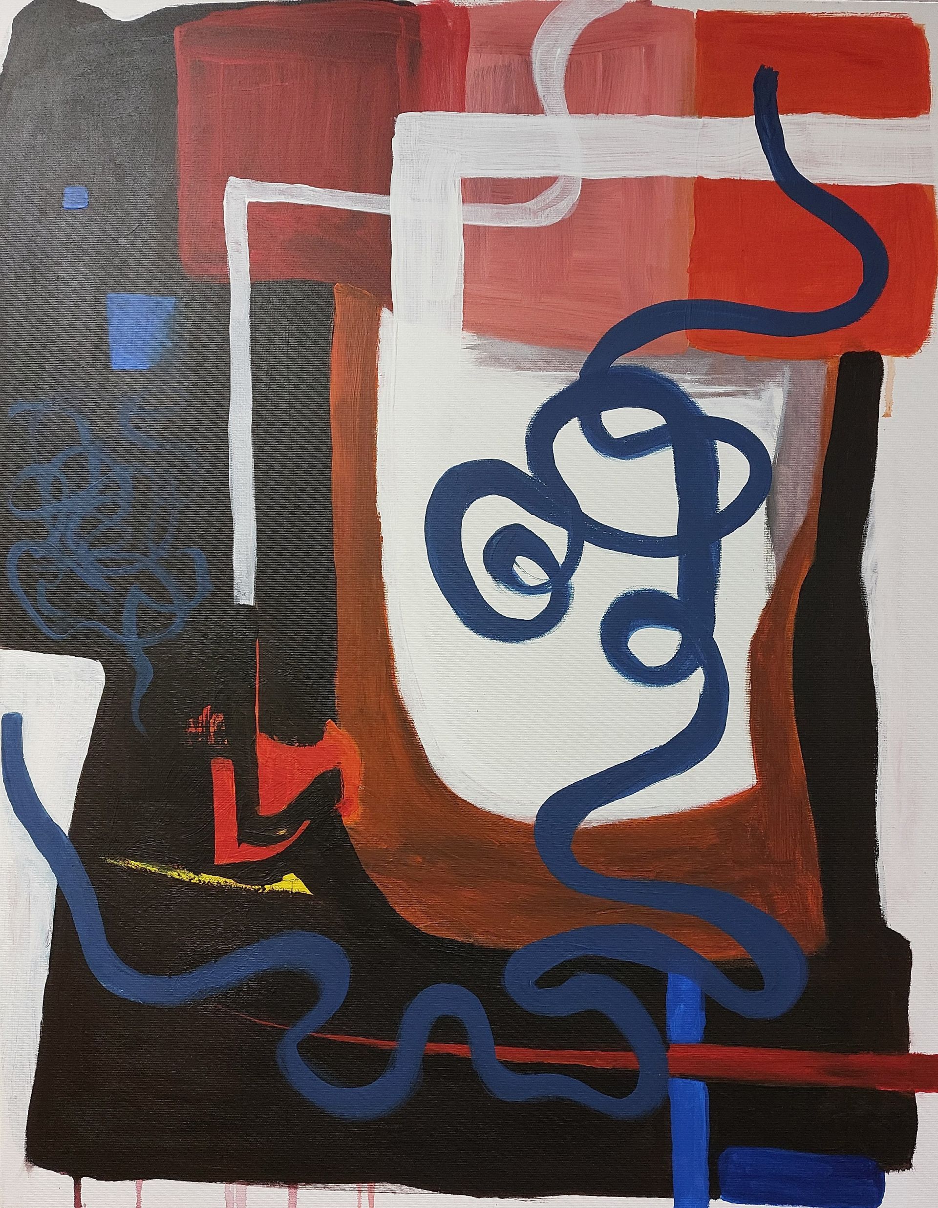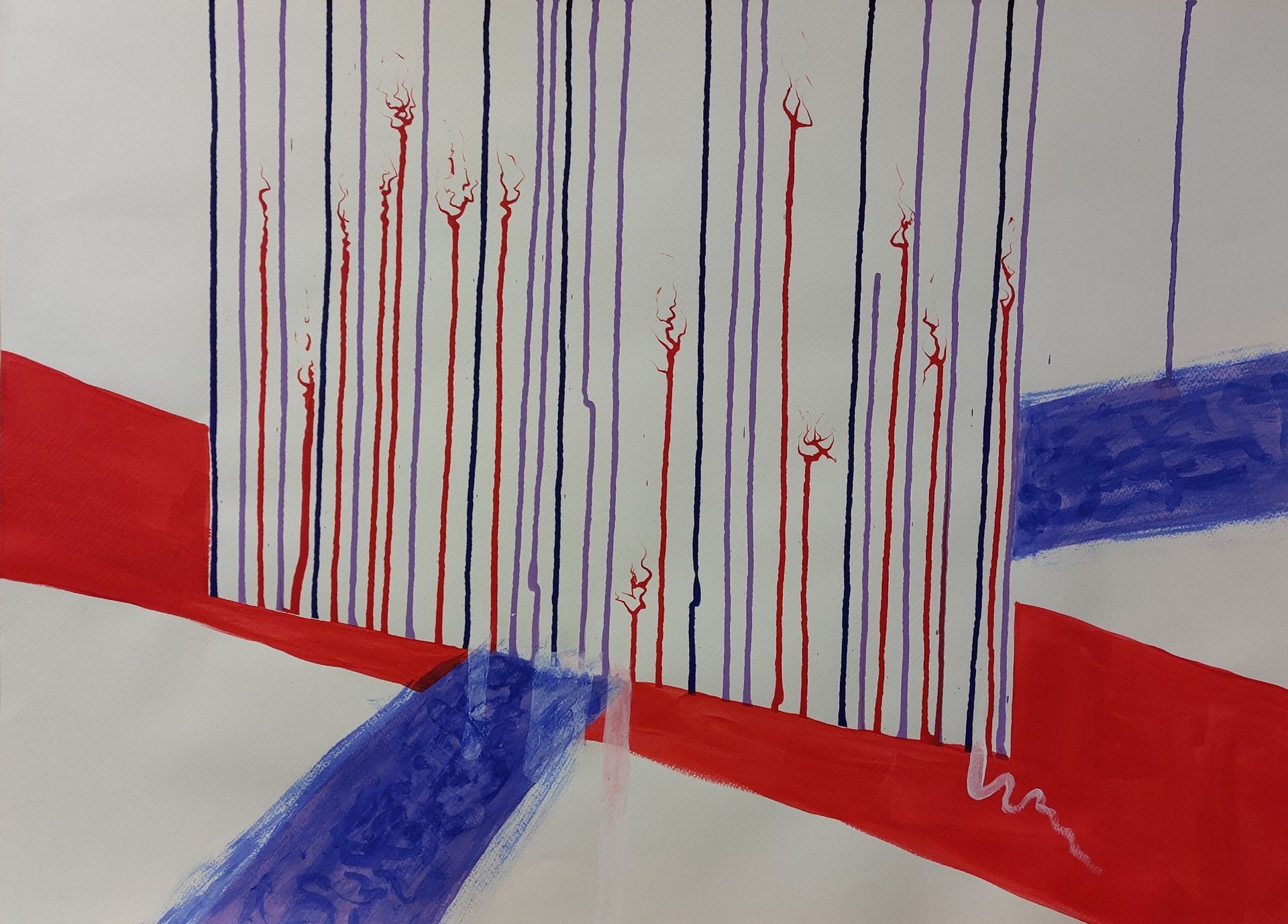 Nach einer längeren Pause beginne ich mit Stöcken, Schwämmen und mit Acrylfarben auf Leinwänden zu arbeiten. Siebe, Zahnbürsten, Plastikkarten kommen dazu. Malen mit Fingern, Füssen und Armen verbinden mich mit Farbe und Ausdruck.