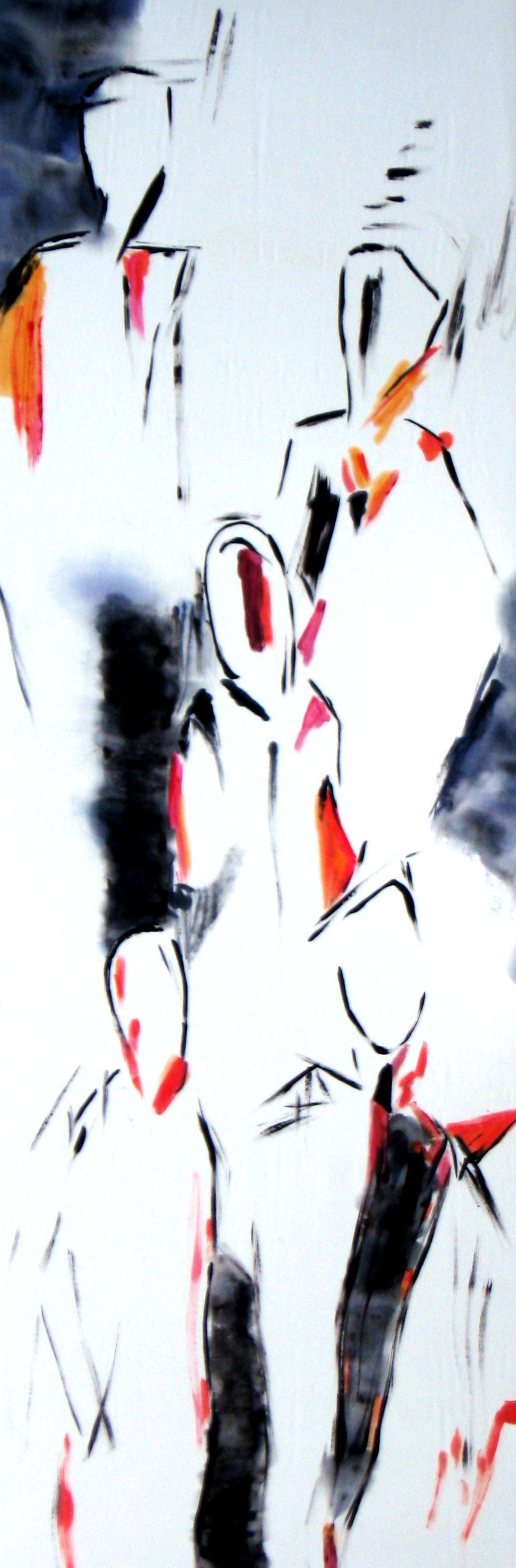 Nach einer längeren Pause beginne ich mit Stöcken, Schwämmen und mit Acrylfarben auf Leinwänden zu arbeiten. Siebe, Zahnbürsten, Plastikkarten kommen dazu. Malen mit Fingern, Füssen und Armen verbinden mich mit Farbe und Ausdruck.