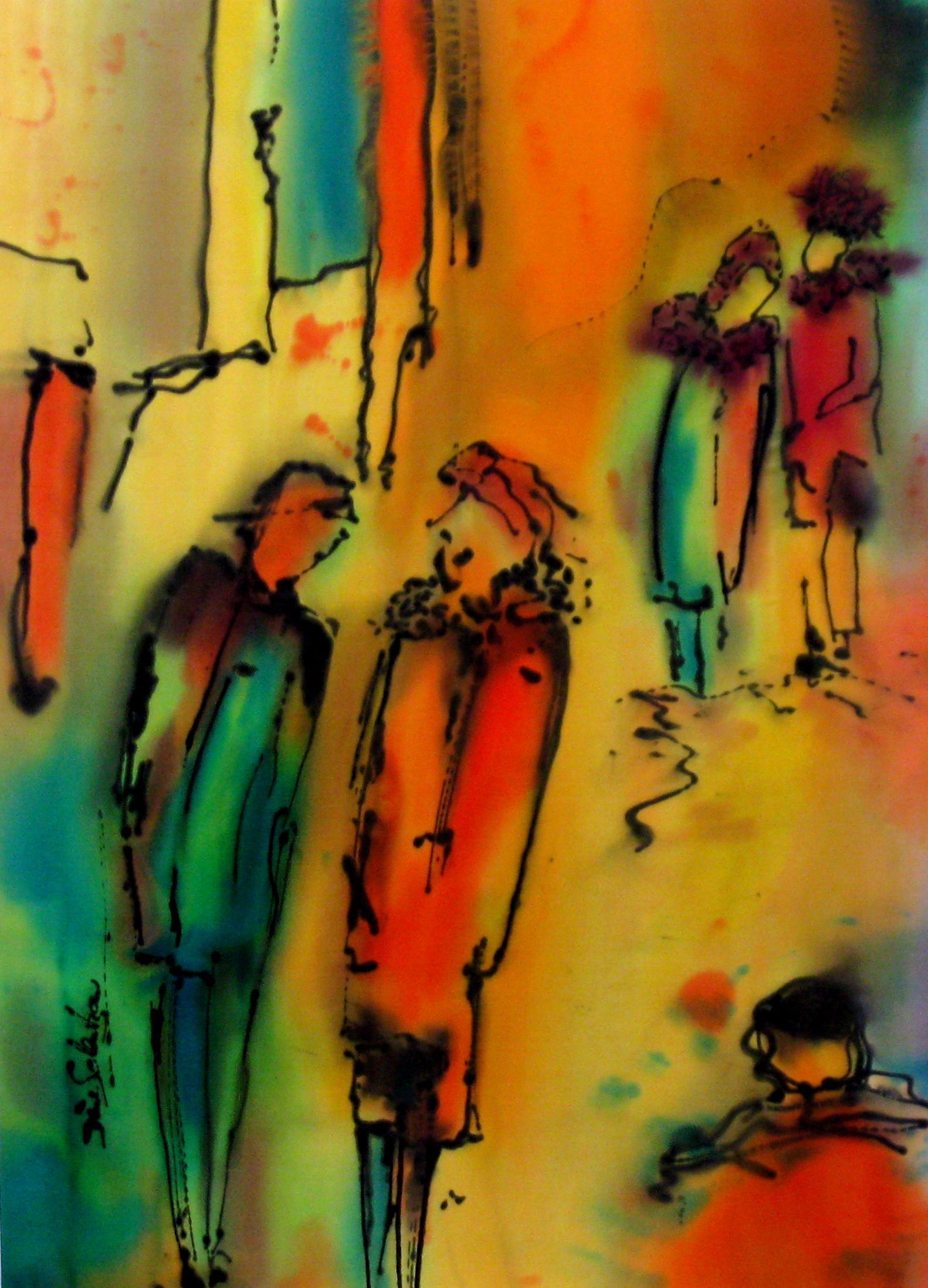 Luizide Farben und alte, weiter entwickelte Seidenmaltechniken wechseln sich ab mit ihrem modernen Zeichenstrich.